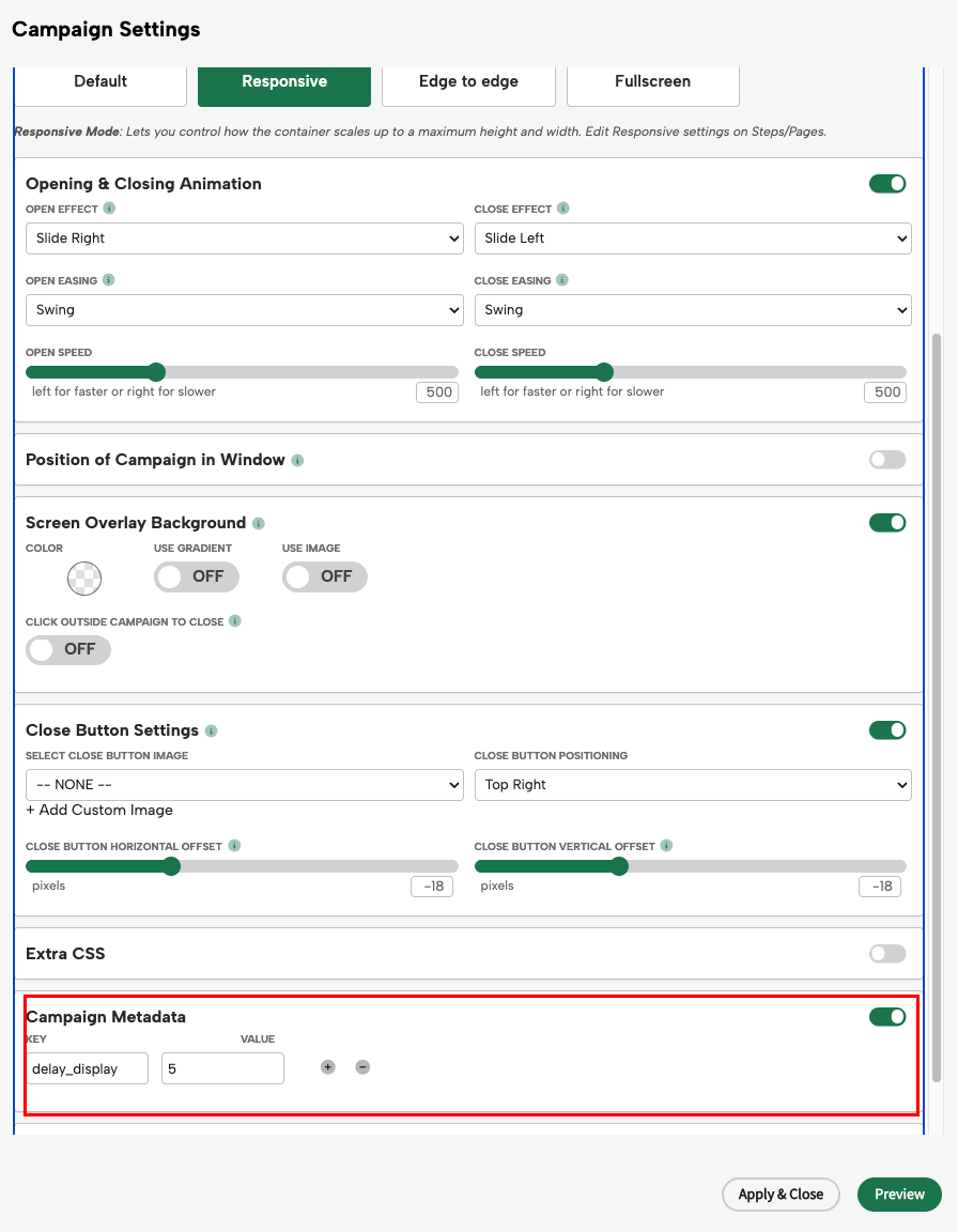 This configuration will ensure that the display of this Campaign is delayed for 5 seconds after a prior campaign was closed.