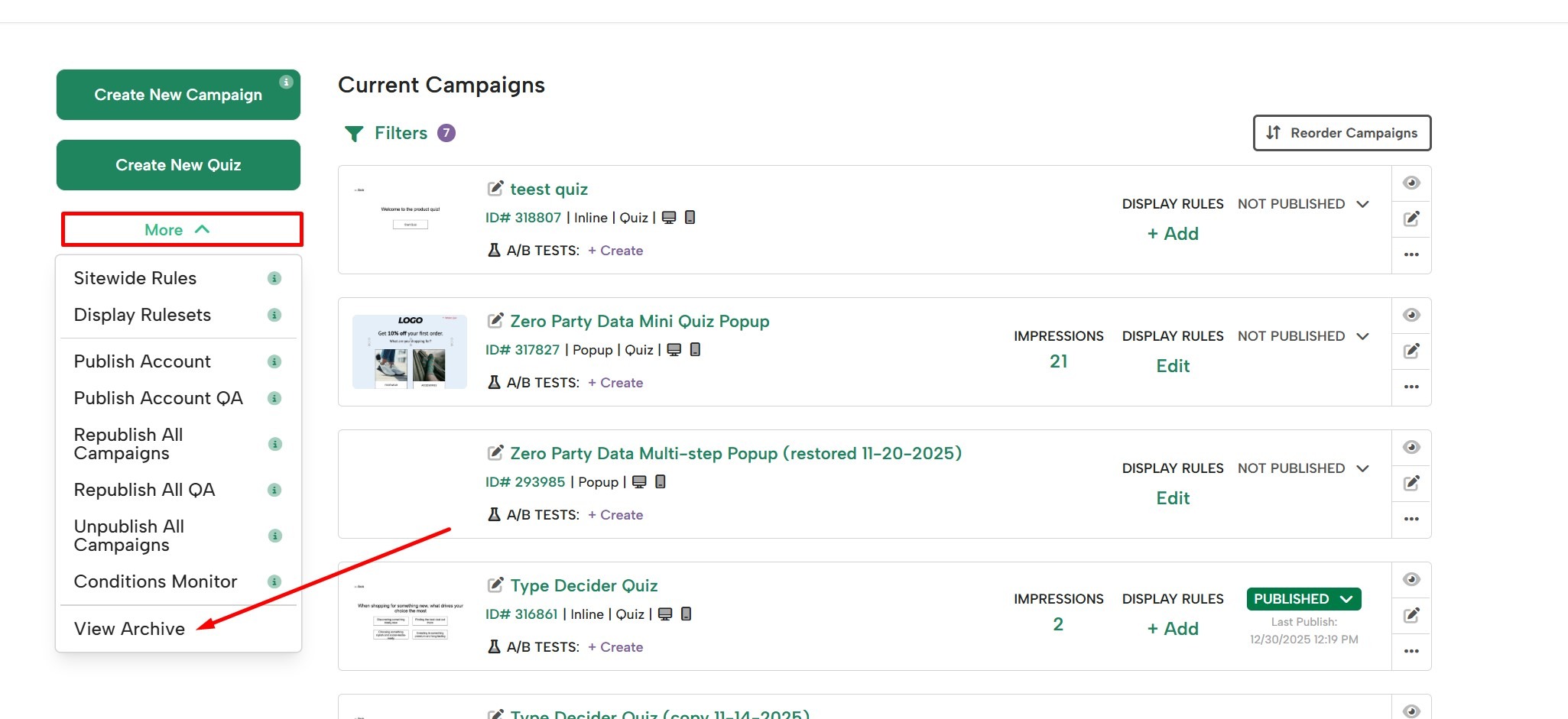 Open the More menu from the campaign dashboard and click View Archive.