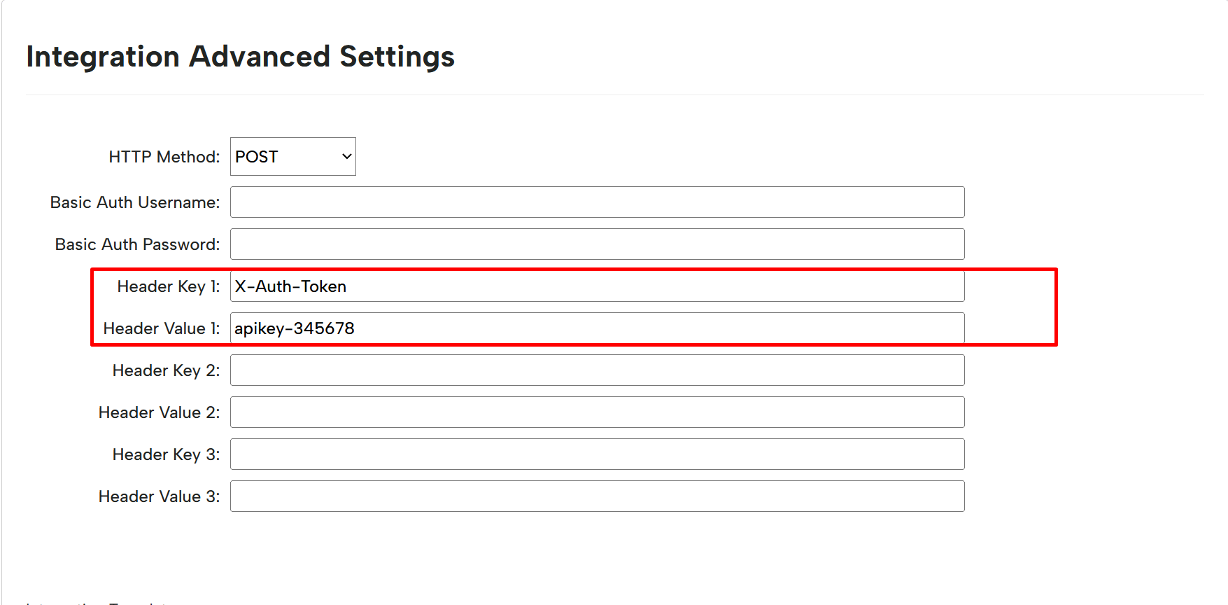 On the advanced integration page, set the HTTP method to POST, then enter the Header 1 key and value like the below image.