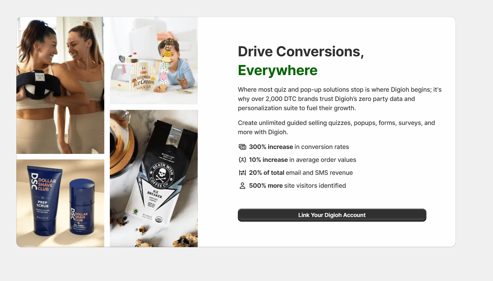 - If you ever publish or switch to a new theme, the Digioh Embed toggle remains as a reminder to turn it on—eliminating lost pop-ups or quizzes after theme updates.