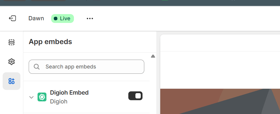 - In the Shopify Theme Editor sidebar, find Digioh Embed and toggle it On.