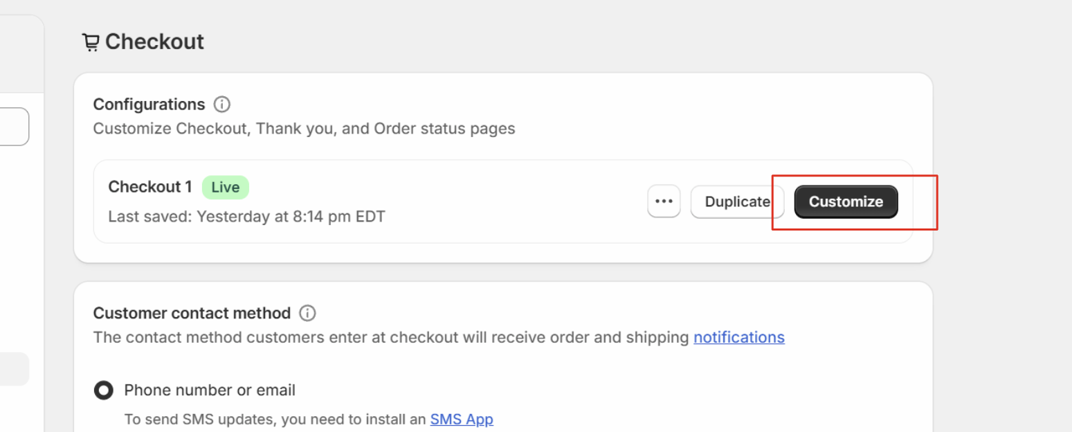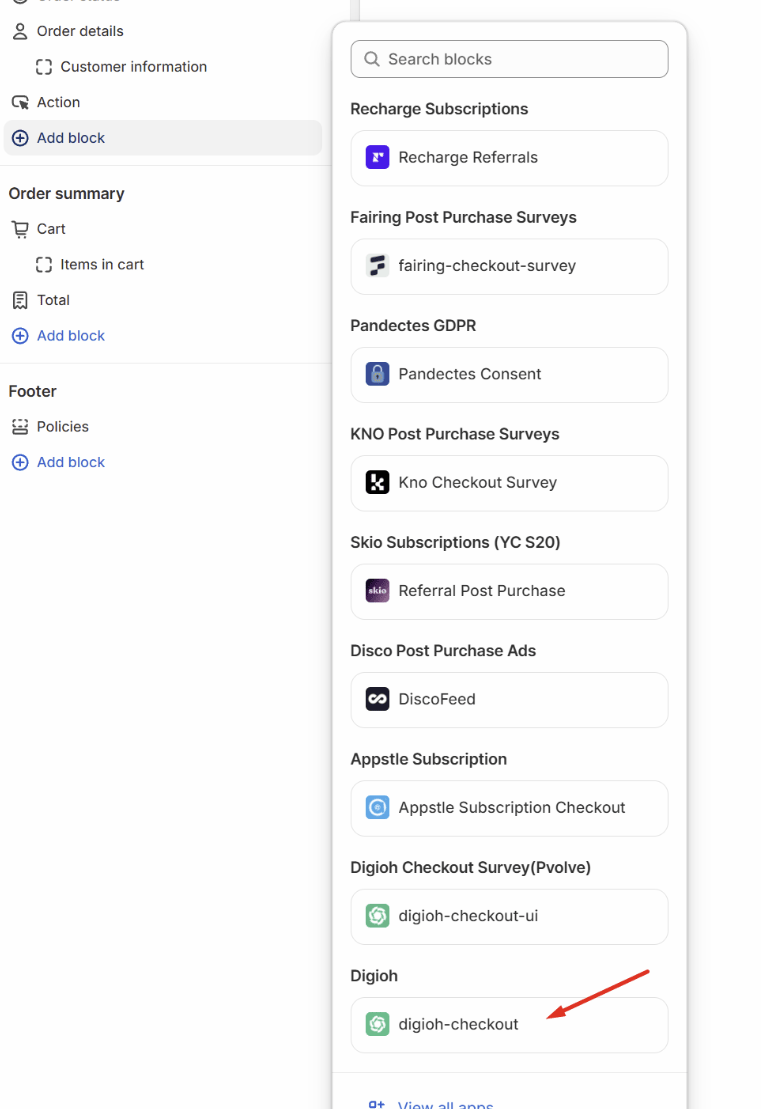 Open the Shopify Theme Editor → Customize. You’ll see a ‘Digioh Checkout’ block available: