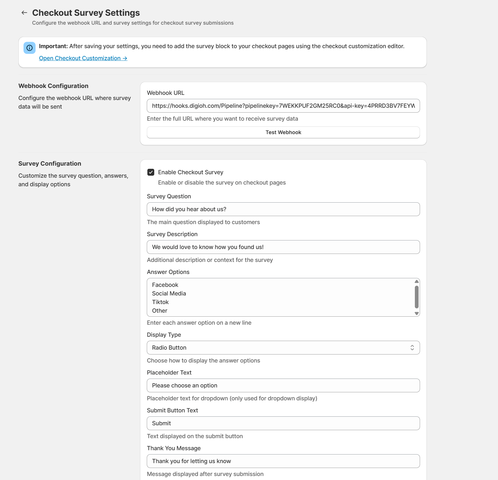 With the updated Shopify app flow, you can build a single-page post-checkout survey directly from the app and send results to your PostCheckout Pipeline via webhook—no more Google Sheet or custom checkout block. (We currently support a one-page survey in this flow.)