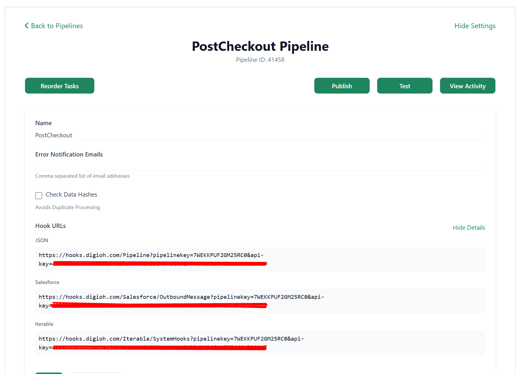 No responses downstream? Re-check you copied the correct Hook URL and that your destination webhook expects POST. Run a Pipeline Test to validate end-to-end.